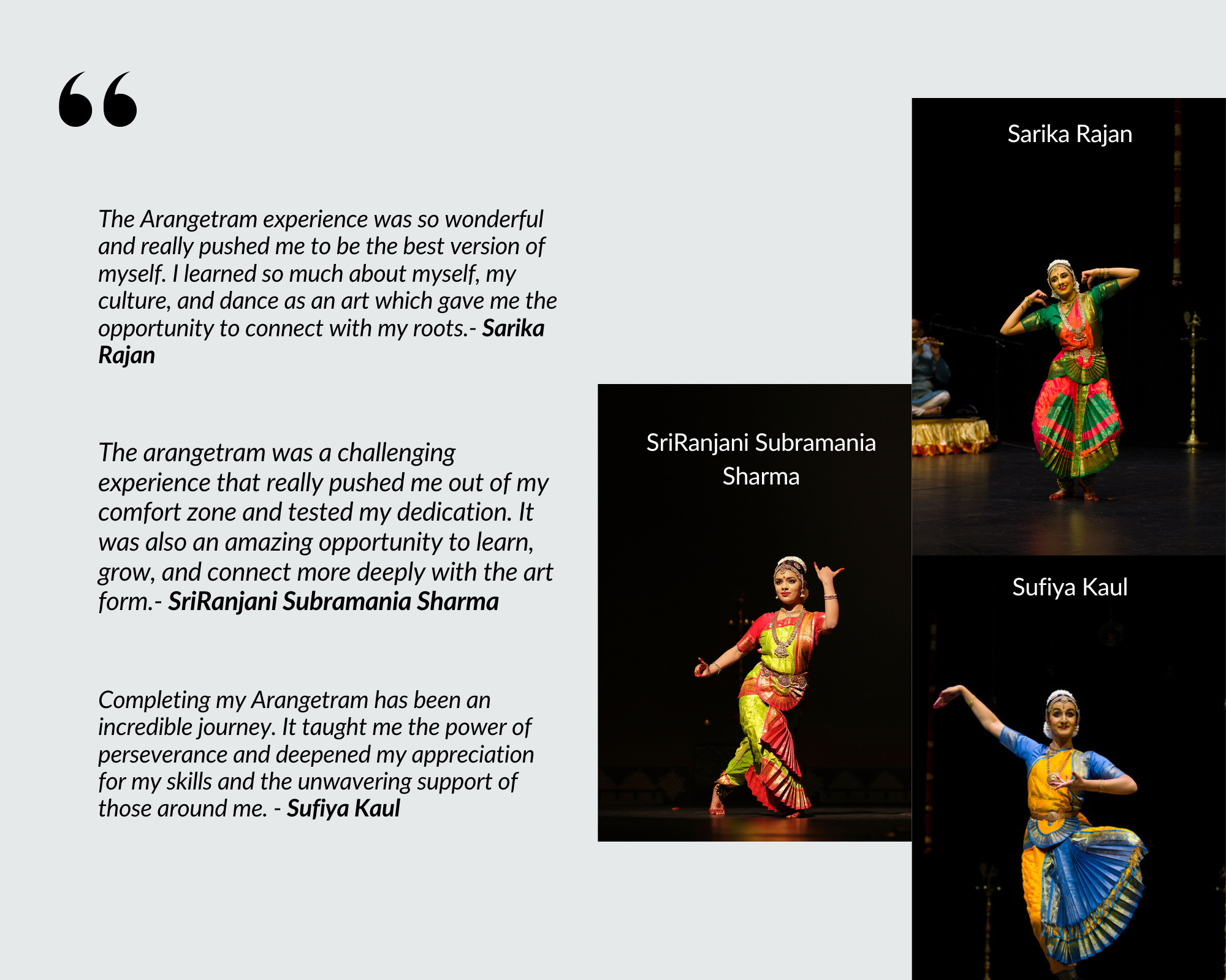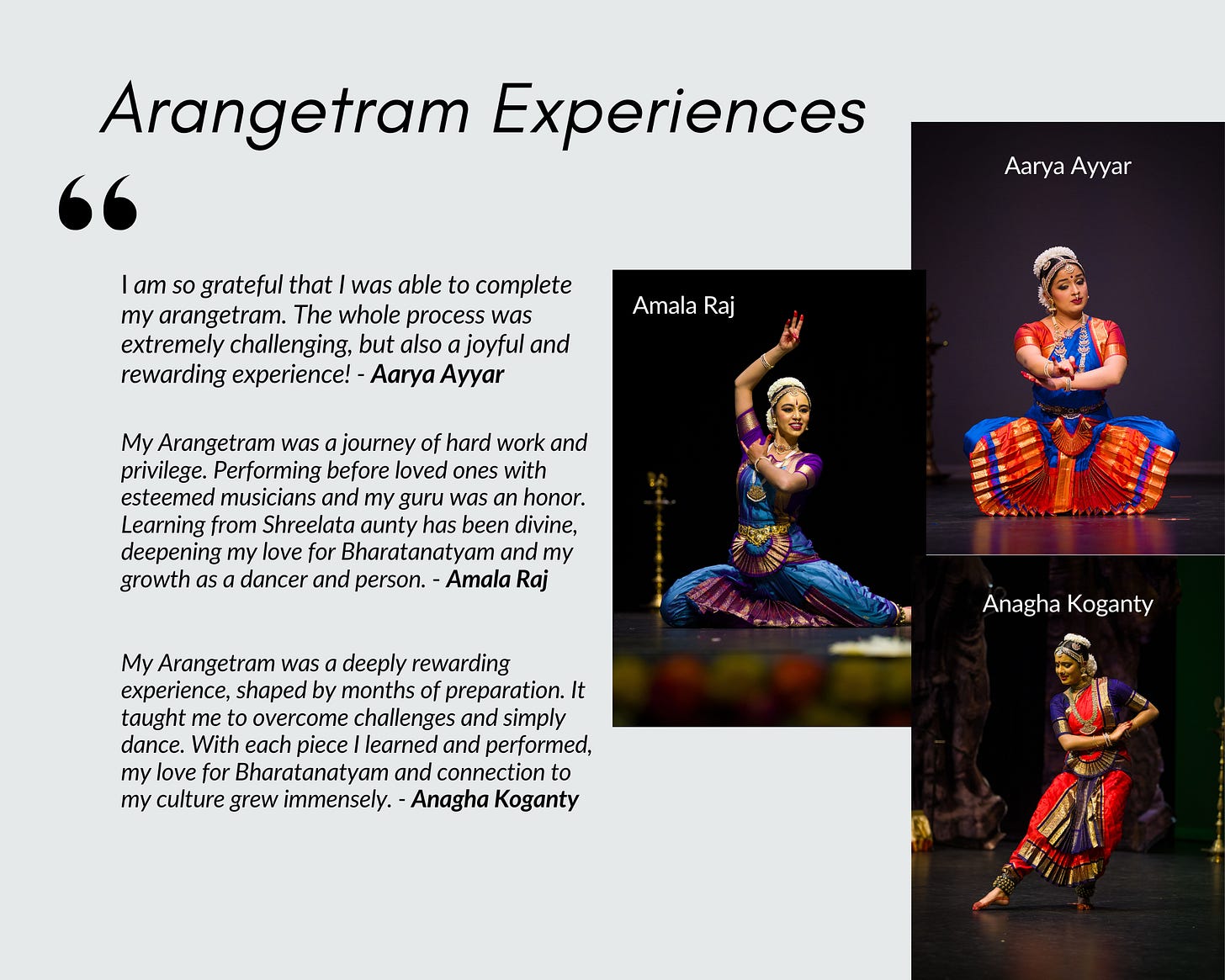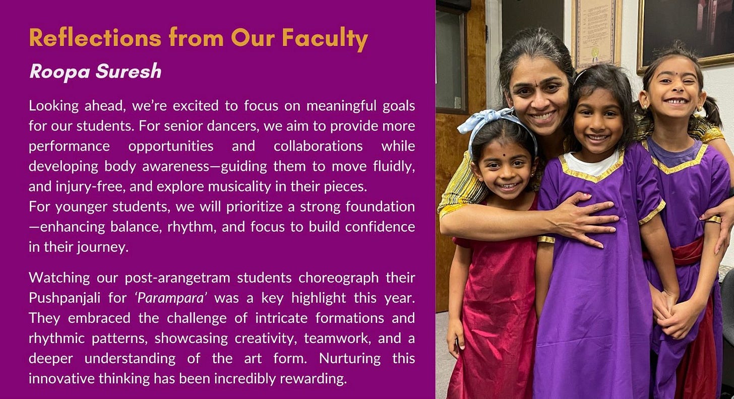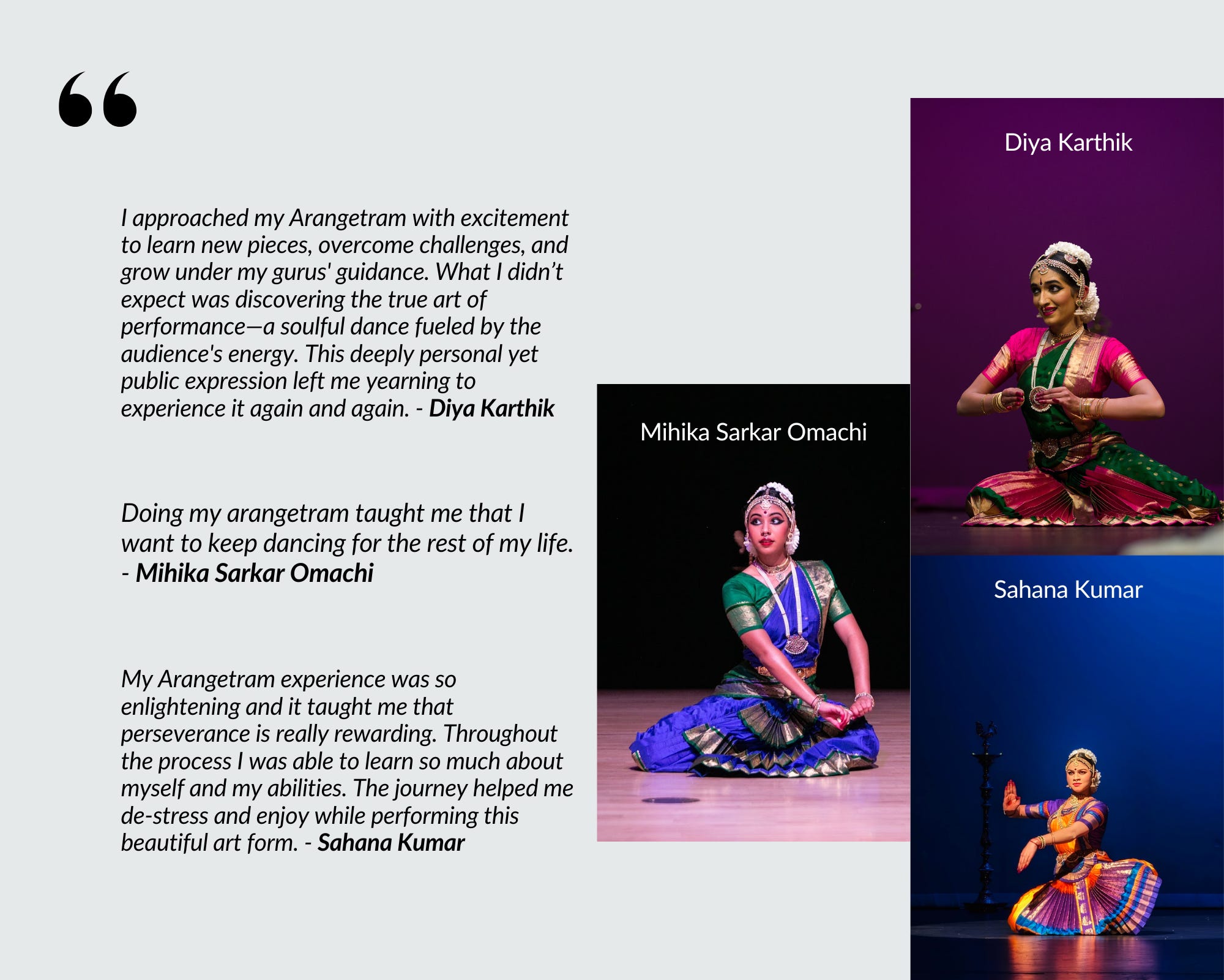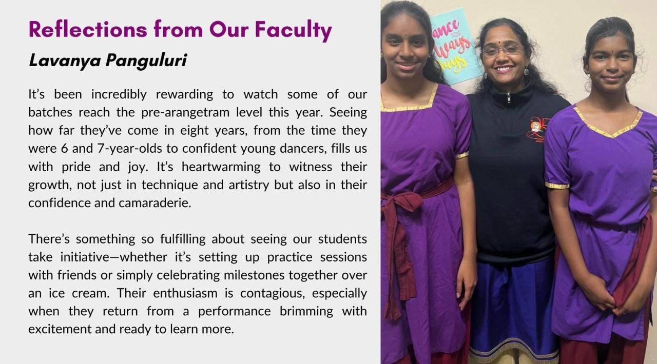 Below, we share a few reflections from our students on their Arangetram experiences – stories that capture the joy of performance, personal growth, and unwavering dedication.