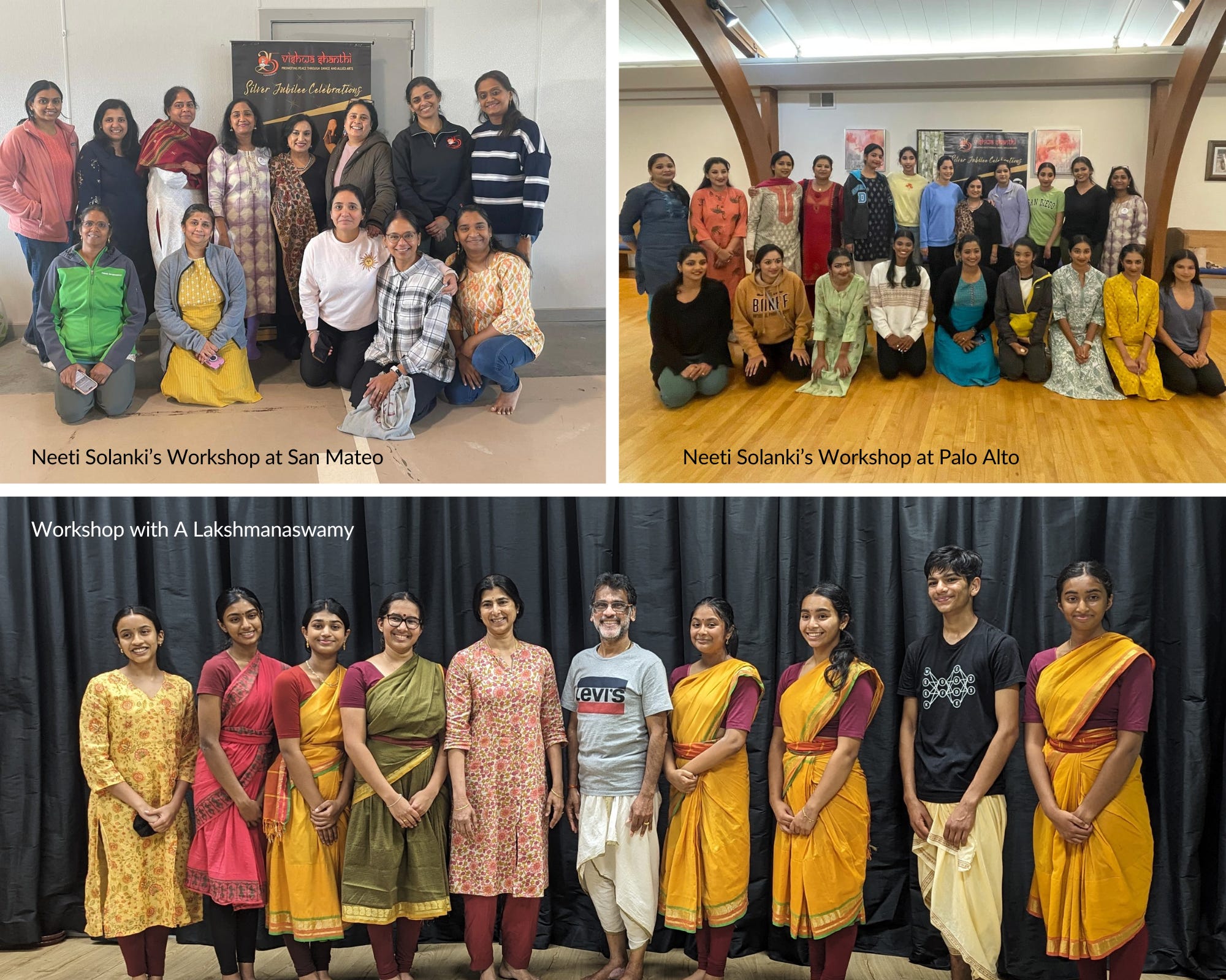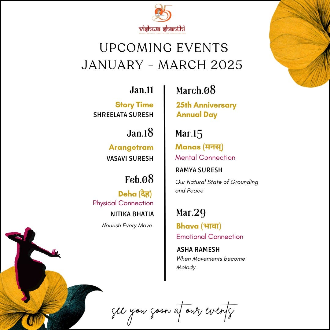 As part of our commitment to fostering community connections, we hosted two enriching workshops at Vishwa Shanthi Dance Academy. Sri A Lakshmanaswamy, Director of Nrityalakshana, Chennai, offered our pre-arangetram students a fresh perspective by teaching a beautiful Varnam on Lord Muruga, building on their strong foundation at VSDA. Additionally, Bay Area’s renowned artist Ms. Neeti Solanki led a Bharatanatyam Makeup Workshop, where participants honed their performance makeup skills, enhancing their stage presence and professionalism.