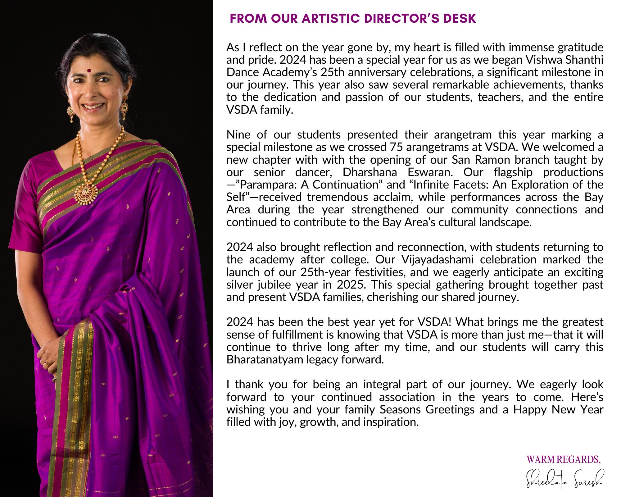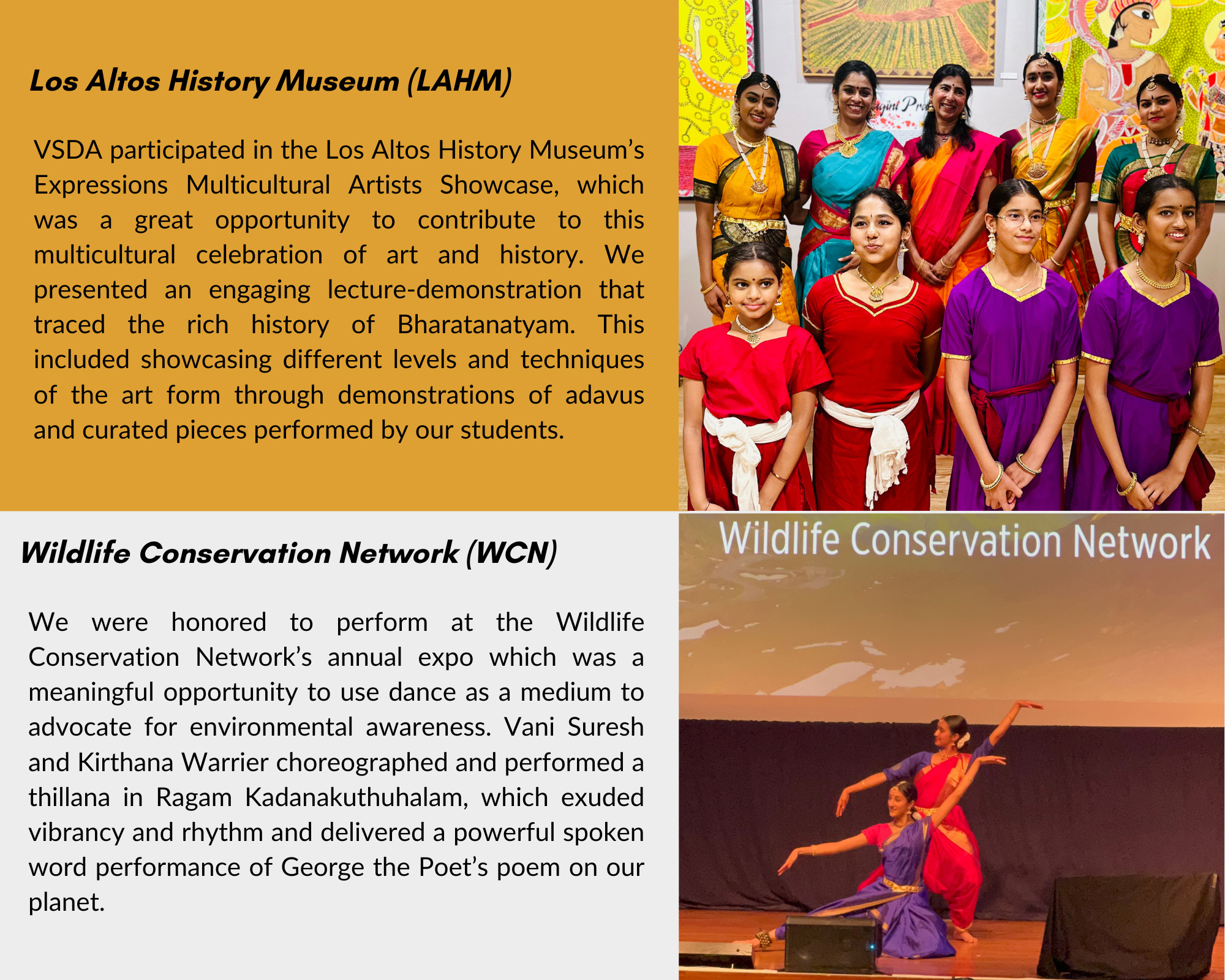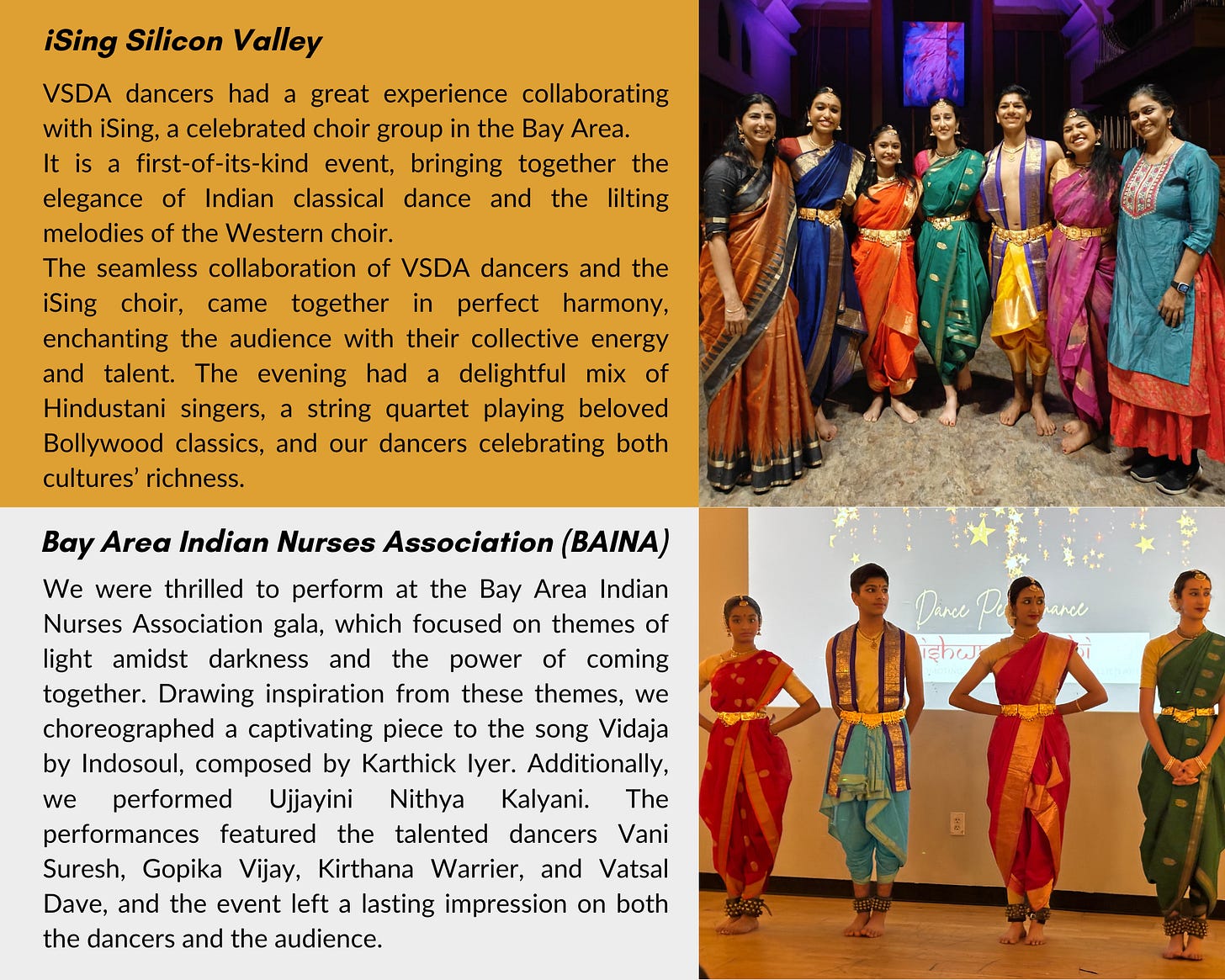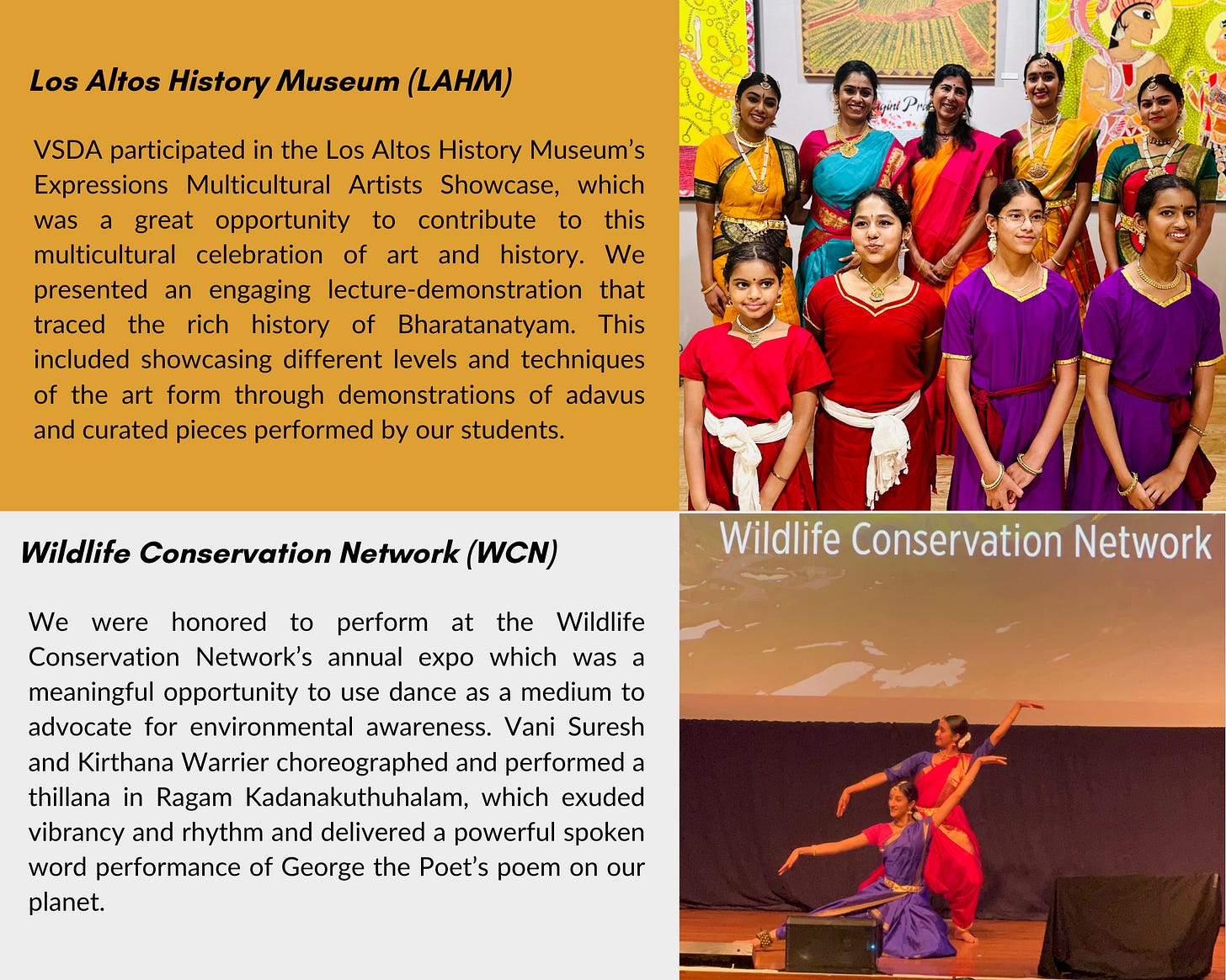 VSDA was proud to present several performances this year across the Bay Area, reinforcing our commitment to being an integral part of the local community. These performances allow us to engage with diverse audiences, share the richness of Bharatanatyam, and foster connections through art, which is central to our work.